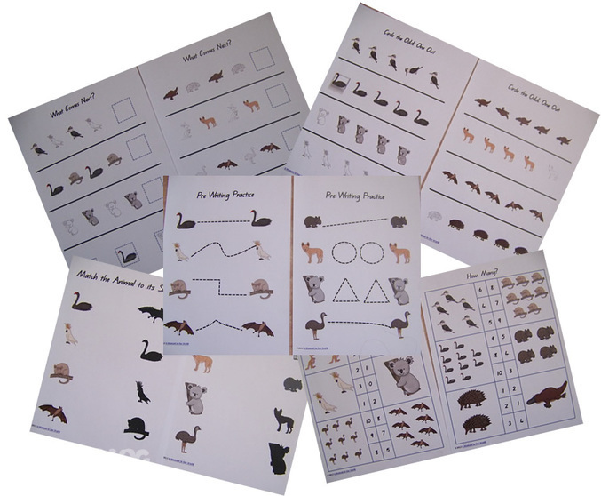 Изначально хотела подготовить материал сама, но времени у меня хватило только на карточки с размером и пару-тройку дорожек-проводилок, поэтому воспользовалась материалом с блога A moment in our world - вот ссылка на материал, там можно его скачать (под фотографией нажать Australian animals).