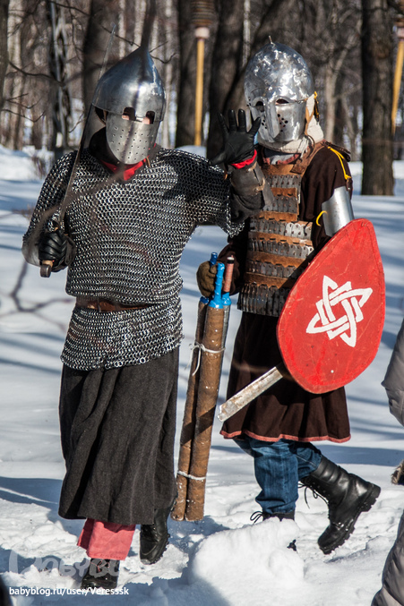 После того, как собралась основная часть народу, к нам, с показательными выступлениями, пожаловали воины из военно-исторического клуба "Вороний камень". Продемонстрировав, как на Руси сражались богатыри, ребята достали целый рюкзак мягких мечей и предложили желающим попробовать себя в роли защитников Отечества