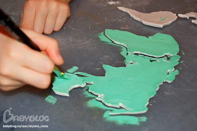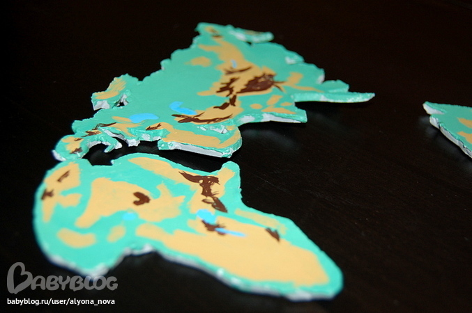 На этот раз взяли самозастывающую массу для лепки Jovi (можно воспользоваться и соленым тестом) и вырезали по трафарету все континенты. Всего шесть: Евразия (Европа + Азия), Африка, Австралия, Антарктида, Северная Америка и Южная Америка. Рассказала, что на долю суши – материков и островов – приходится совсем мало поверхности Земли (около 29%), остальное – моря-океаны. Материки (или континенты) – самые значительные, поэтому их и лепим)))