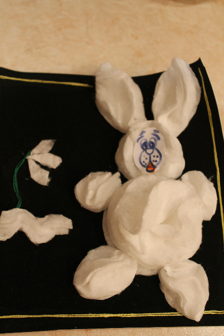 Следующим этапом делали шкурку, с помощью ПВА и салфеток, моя любимая техника, в несколько слоев клей и салфетки и кролик получился очень текстурным.