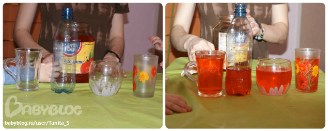 2. Окрасли воду пищевым красителем, чтобы было нагляднее и наполнили этой водой разные ёмкости.