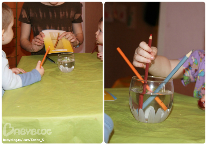4. «Ломали» карандаши в воде. Каждый свой карандаш. Но в итоге рассматривали, когда в стакане был один карандаш.