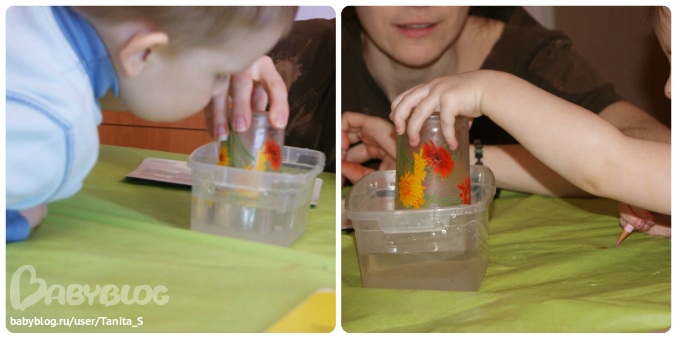 6. Опускали стакан вверх дном. Потом выпускали воздух, булькали им. Деткам это особенно понравилось. Чуть позже еще пузыри через трубочку пускали.