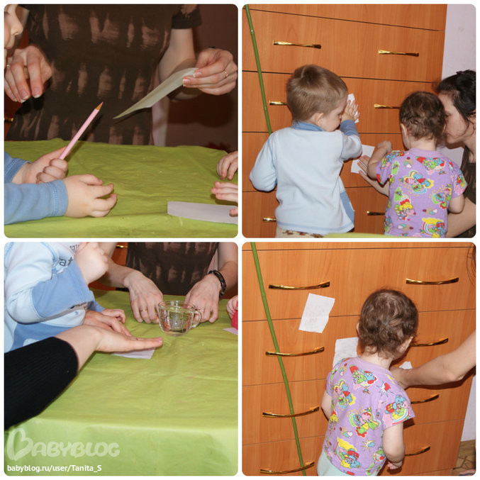 3. «Приклеивали» сухой листочек бумаги к комоду. Конечно, это не получалось. Намочили свои листочки и ооо, чудо!!! Листочки приклеились!!!
