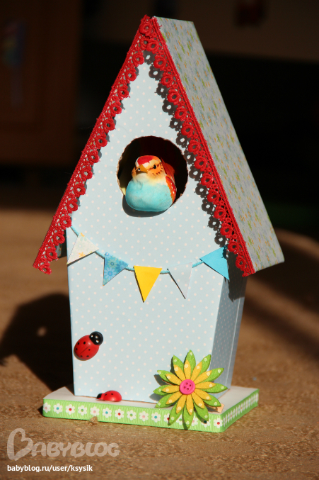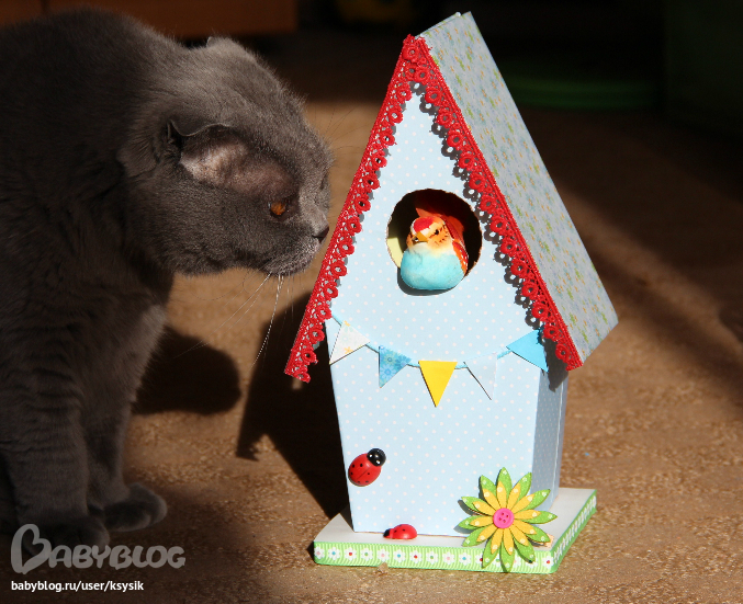 Скворечник конечно хлюпенький получился, торопилась и уже не до этого было((( Пока стоит на комодике у Алешки, но планирую повесить на стену рядом с большой весенней раскраской. А потом не знаю, может другой капитальный сделаю, для декора дома)))