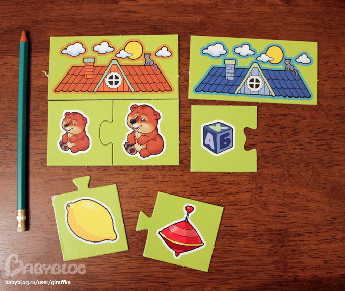 Эти у сына самые любимые, играет каждый день. Сначала просто собирал большое к маленькому, недели две назад начал уже сам складывать собранные парочки под крыши соответствующего цвета. Когда подрастёт, там ещё есть циферки, которые можно подставлять к получившимся домикам, посчитав, сколько под какой крышей парочек сложено.