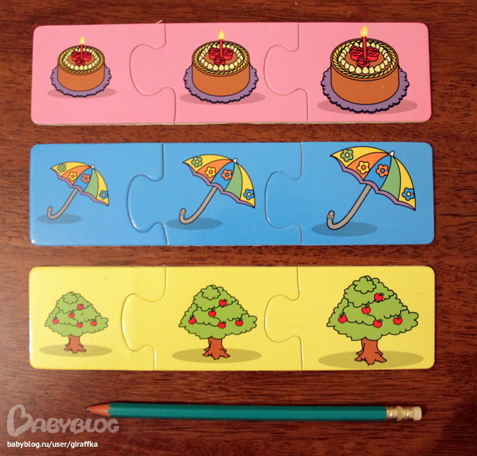 Пазлы на деревянной основе, не супер аккуратные (попадаются заусенцы), но, вроде, не цеплючие. В ручке держать удобно, соединяются очень хорошо. Крепкие, долговечные. Соединения в разных цепочках разные, т.е. дерево с зонтиком, например, соединить не получится. Цепочек много, я обычно выдаю примерно треть, чтобы внимание не рассеивалось. Здорово отрабатываются понятия "большой - средний - маленький", "самый большой - самый маленький", "больше - меньше". Плюс тренировка мелкой моторики.