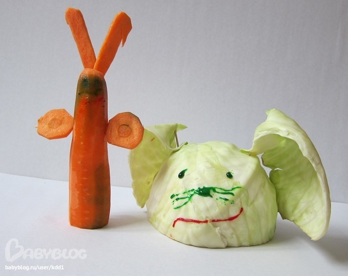 "Овощной" материал для поделки мы выбрали неспроста. На улице снег, холодно, кролики в лесу голодают. Надо бы помочь. Как здорово, когда ты весь сделан из своего любимого лакомства, тогда тебе никакой голод не страшен, вот только небольшая опасность, что другие зайцы тебя съедят)))