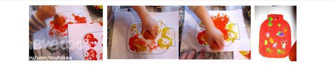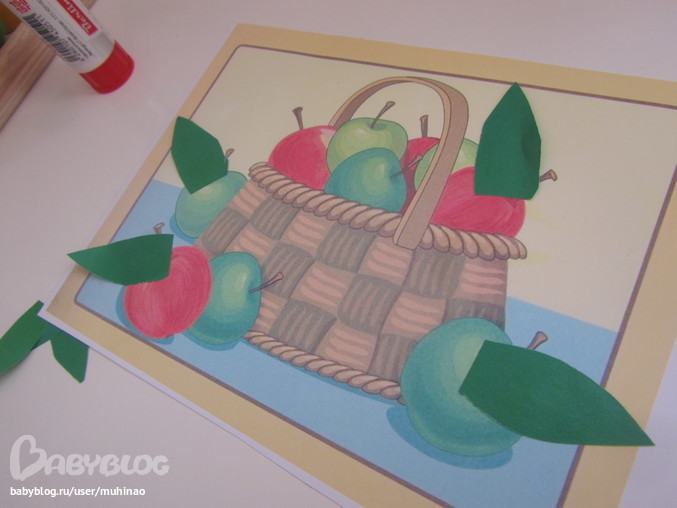 Хотели сделать компот из яблок, но что то такая техника рисования нас подвела, и мы просто замазюкали шаблоны краской и после высыхания наклеили наклейки
