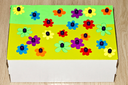 Заранее сделала коробочку с зеленой поверхностью. Наклеила цветочки с цветами, которые прошли и продырявила серединки.