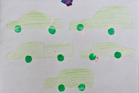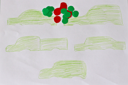Задача малыша была, чтобы он приклеил только зеленые колеса зеленым машинкам: