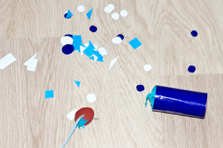 После того, как он дернул веревочку, из нее посыпались синие и голубые геометрические фигурки: