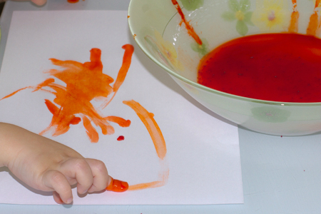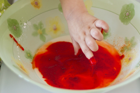 Поставила перед малышом миску с крахмально-мучной массой и порошком пищевого красителя.