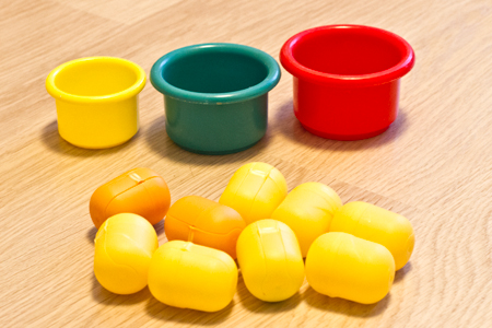 А в конце дня я разложила перед ребенком чашечки в знакомой ему расцветке (желтую, красную и зеленую). И высыпала перед ним коробочки от киндер-сюрприза.