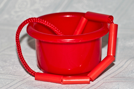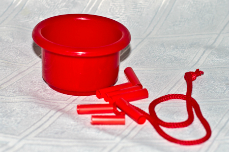 Потом нарезала соломку на несколько частей. Положила ее в красную чашку, и дала сыну красную веревку, чтобы он нанизывал на ее: