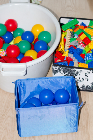 Собрали все фигурки в синюю коробку и туда же стали складывать синие шарики и детали от Лего: