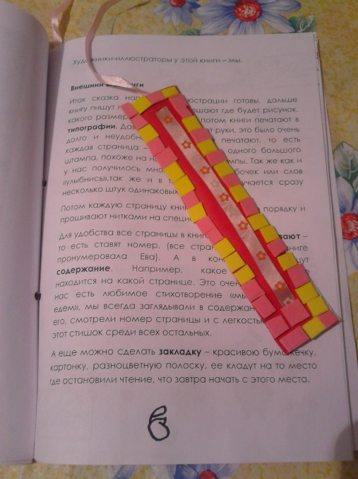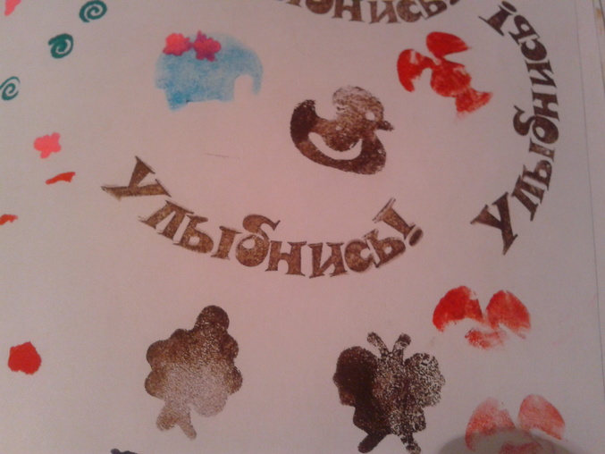 "Сейчас книги печатают, то есть каждая страница – это что-то вроде одного большого штампа, похоже на наши детские штампы. Так же как и у нас получилось много слоников, бабочек или слов «улыбнись»,так же и в типографии получается сразу несколько штук одинаковых книг" -