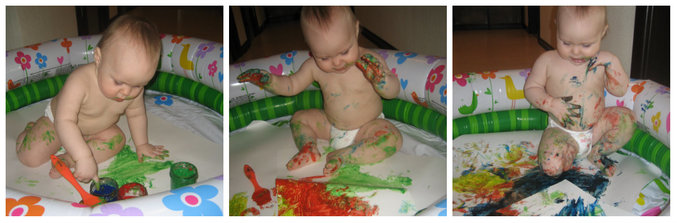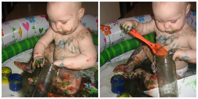 Правда, пальчиковые краски не очень подошли, нужны более жидкие. Следующий раз, обязательно сделаю сама. Сначала я показала, как мы макаем кисть в краски и проводим по листу. Яночка взяла кисточку, внимательно на нее посмотрела, отбросила в сторону и начала рисовать привычным для нее способом.