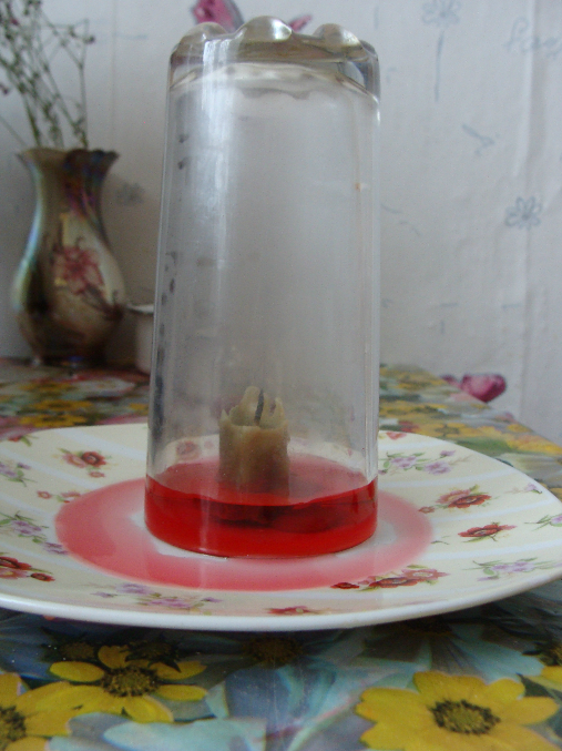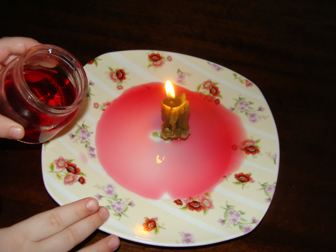 Итак, тарелка, свеча, крашеная вода (в оригинале вино, но и с водой результат тот же)