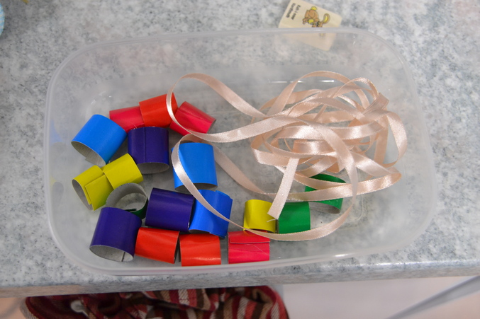 Прежде всего Матвею нужно было сделать бусы. Это был его первый опыт нанизования и так как я дома не нашла бусьнок с большой дырочкой, то сделала вот такие из цветного картона и дала ленточку, задание прошло на ура и обезьянка стала счастливой обладательницей бус.