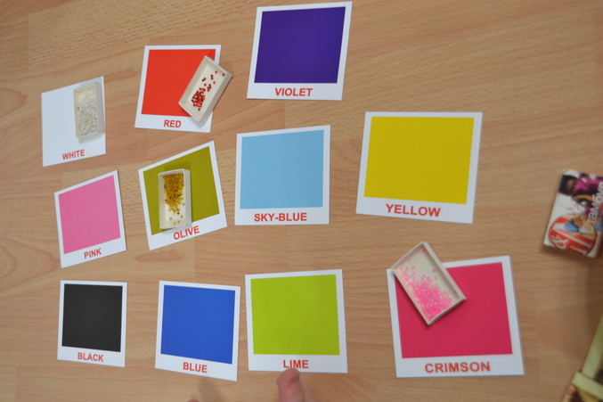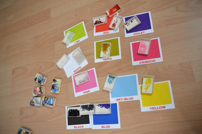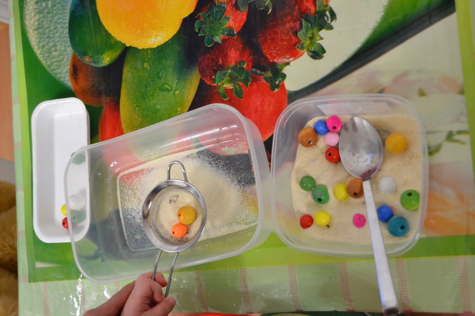 Ну и на последок, наша любимая игра, в которую мы потом играли еще недели две. Нужно разложить коробочки с бисером на карточку, которая больше всего подходит по цвету. На мое удивление, когда мы в первый раз играли, то Матвей даже не рассыпал бисер, а если в дальнейшем и рассыпал, то сам его и собирал, а это отличная тренировка мелкой моторики.