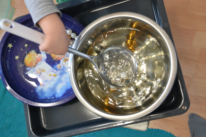 Затем Матвей вылавливал бусинки из воды шумовкой, пожалуй, игры с водой его самые любимые!