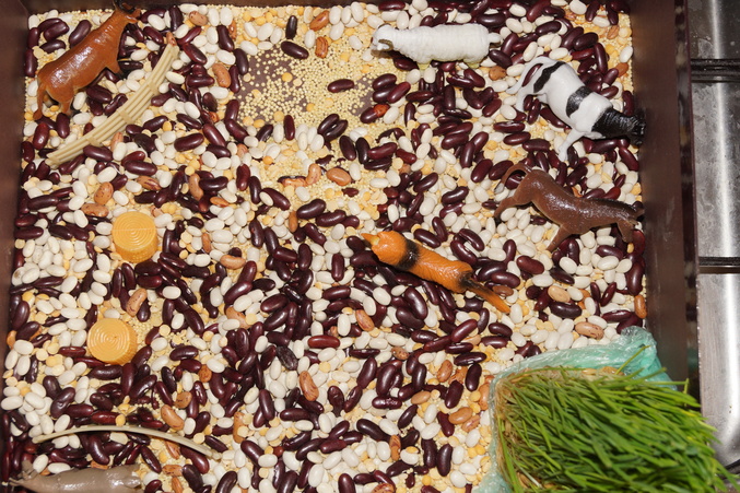 Еще я наклеила наклейки домашних животных на противень и засыпала их манкой, Степаша занимался поиском "сюрпризиков".