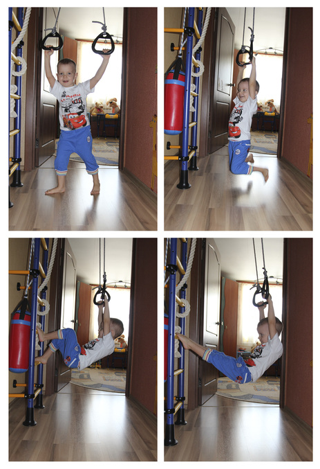 Висеть на кольцах Тёмка очень любит, причем каждый раз придумывает что-нибудь новенькое. А еще любит забираться на самый верх: