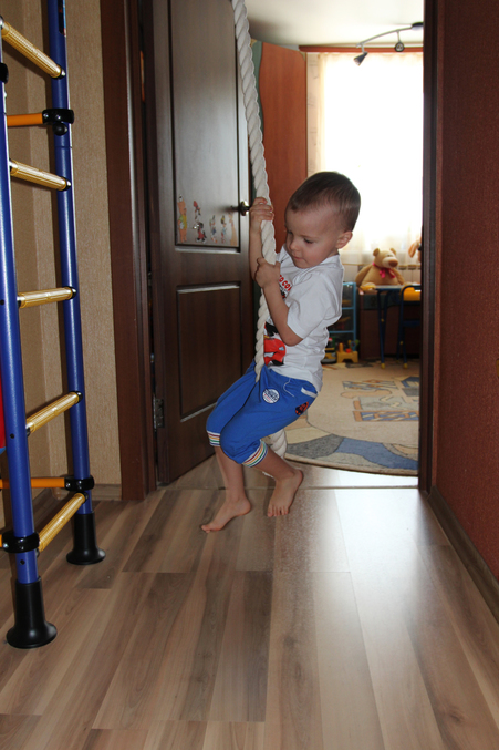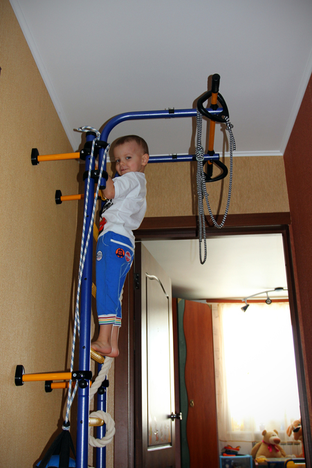 Наверху есть перекладина, каждый вечер, когда папа приходит с работы, на этой перекладине Тёма при помощи папы подтягивается уже 5 раз.