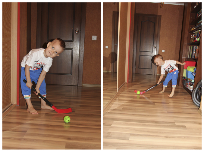 У нас дома большой коридор и это конечно, большой плюс для ребенка, он у меня и на велике дома катается, и в мяч играет, сегодня вот в хоккей резались: