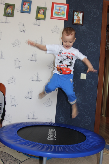 Еще у нас есть детский батут Торнео - великая вещь, купили, когда Артёму было всего 2 годика, прыгает каждый день. Помимо того, что это очень весело для ребенка, батут обладает спортивно-оздоровительными свойствами, повышает тонус мышц, улучшает кровообращение. Вот детка в полёте)))