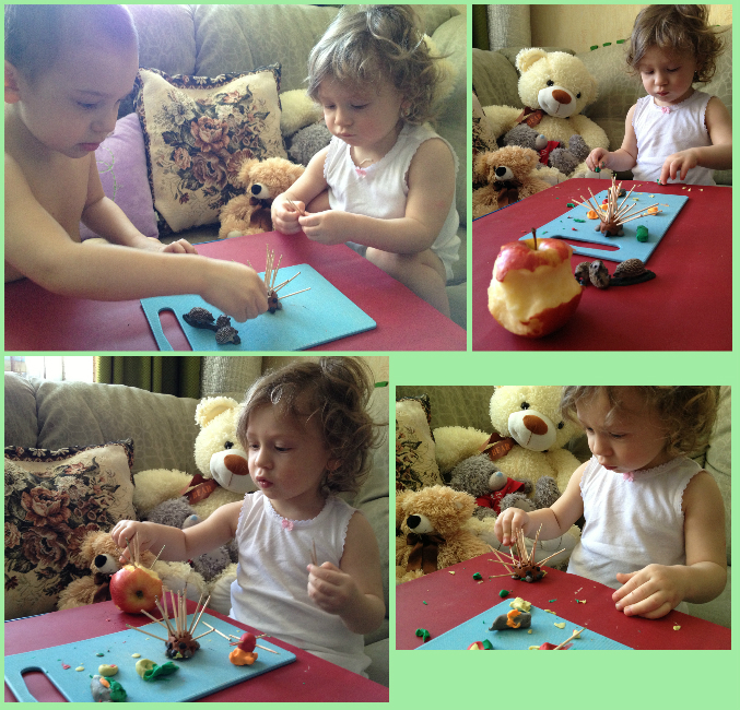 Слепила маленького ежика, выдала зубочистки и поехали )) сделали шубку для ежика, потом лепили вместе для него яблоки, груши и грибы.