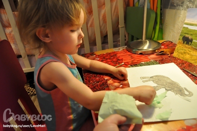Без пластилина тоже не обошлось, рисовали пятнышки жирафу, травку, солнышко и небо.