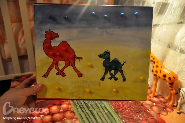 Вике очень понравилась такая игра-мозайка и я сделала еще и верблюдов, там дырочки уже проткнула сама и Вика пальчиками просовывала в них кнопки.