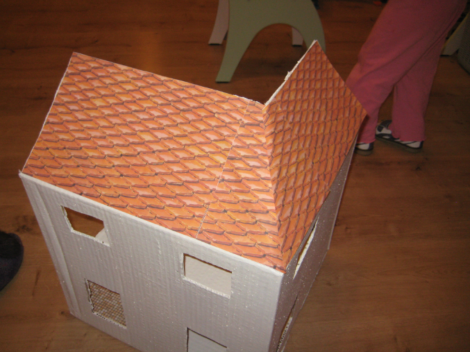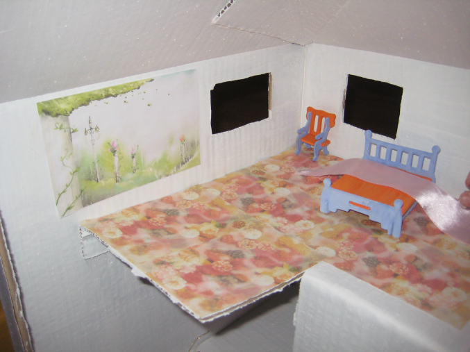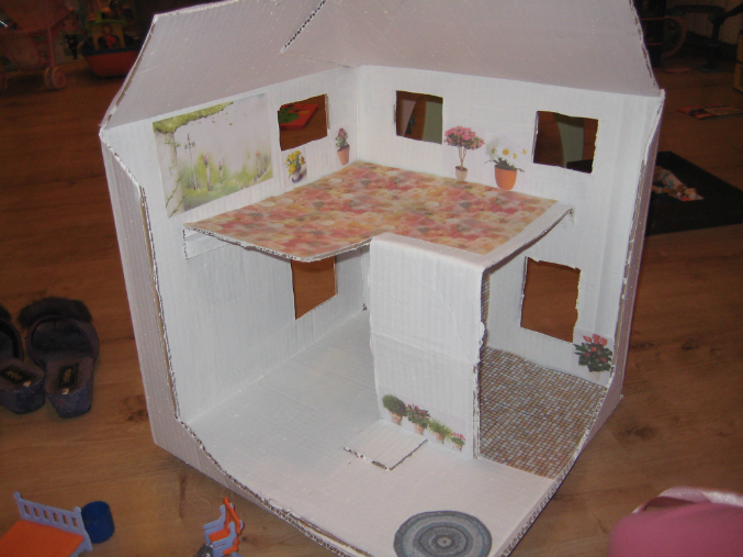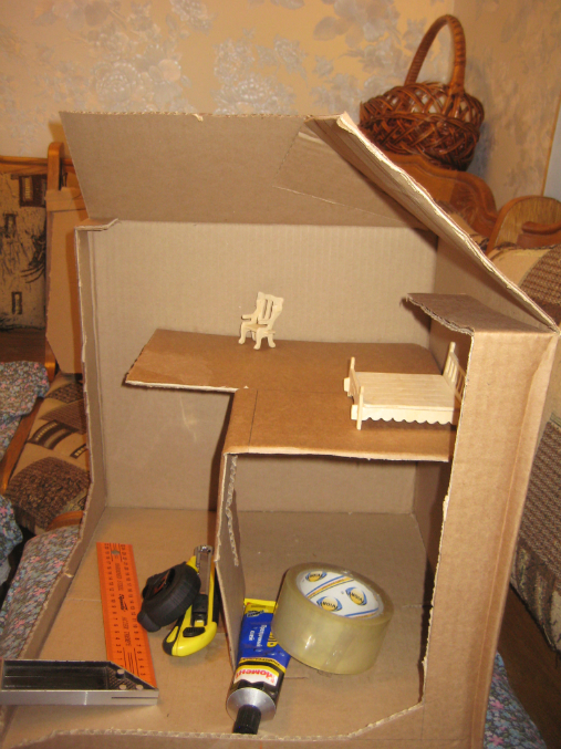 Мебель . Раскрашивали гуашью. А сам домик водоэмульсионной краской. Но еще не все собрали, там очень много предметов =)