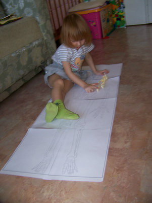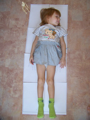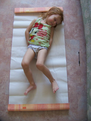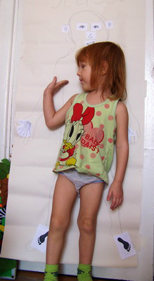 Лизе безумно понравилось обрисовываться, что она требовала еще и еще!!! Хорошо, что в доме не так много пустых рулонов обоев, а то квартира превратилась в армию Лиз))) Остановились на отдельных частях тела - руках и ногах.