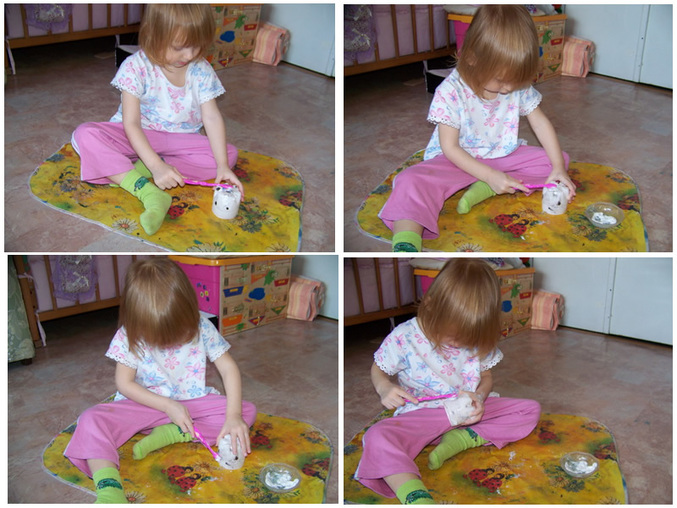 Сначала учились чистить зубки со всех сторон и отчищать остатки еду (черные точки гуаши).