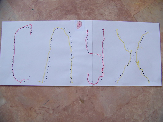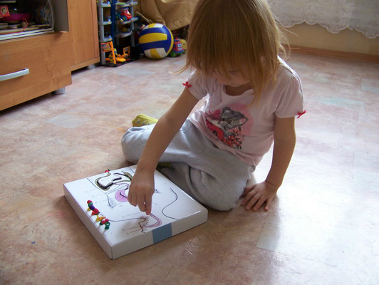 С третей линейкой тоже не все просто... Сначала заявила что рот - он красный, а остальные нет. Тут же развила, что нет, лишний нос, потому что он в квадратике, на этом закончили, но после следующей полоски вернулась и заявила что ноги - их 2! Вот такие умозаключения...