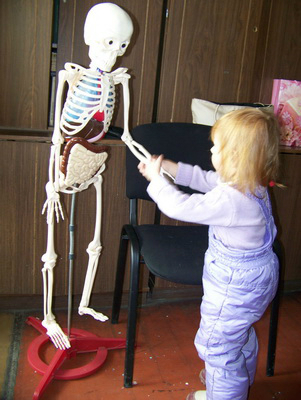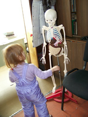Далее в нашей программе знакомство с костями в отдельности и скелетом в целом. Конечно в помощь нам наглядное пособие по прозвищу Папа Романа!