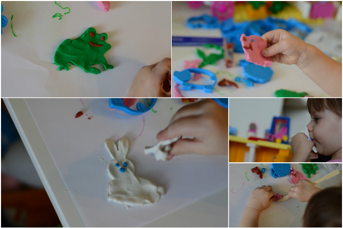 Я ее сделала быстренько, распечатала животных, вырезала и приклеила на пластилин к прещепкам. В первый день хорошо поиграли, а на следующий день пластилин застыл (оказался отвердевающий) и поиграть долго не удалось, больше я показывала, Ми слушала и смотрела.