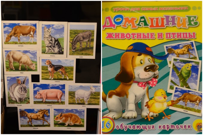 Смотрели их еще в полгода, парочка уже стала непотребного вида, поэтому на шкаф разместили не все. Тк изучать животных нам не нужно было, мы играли с ними несколько иначе: когда в книге или в игре попадалось животное, которое есть на карточках я просила Милану показать его, ей это понравилось и на второй день она уже сама мне напоминала,что корова, например есть в книге, фигурка и карточка...