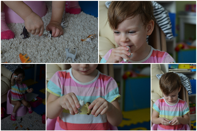 Ну и, конечно просто с фигурками играет. У нас абсолютно все фигурки даже с прошлых недель пользуются огромным успехом. Последняя фишка: Ми знакомит зверят друг с другом)
