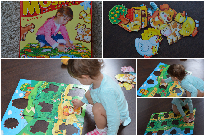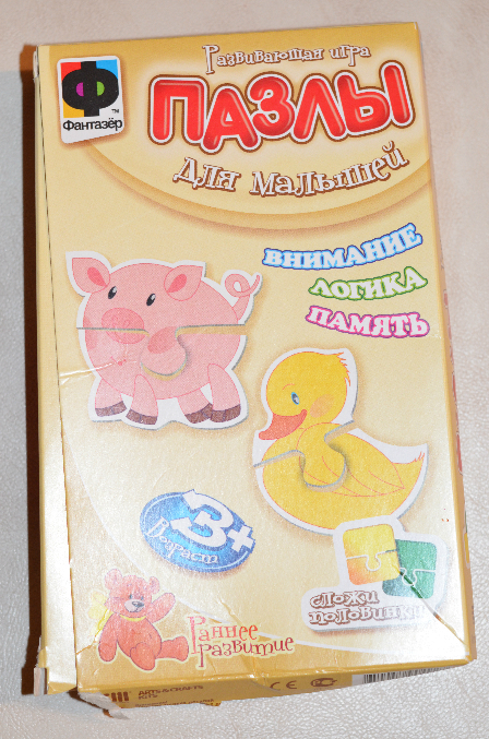 Обычные пазлы из двух частей(качество очень плохое, бумага от картона отскочила практически сразу, приклеила-держится отлично) - Милана собирала сама, из трех еще не понимает, как составлять, а вот два собирает спокойно.