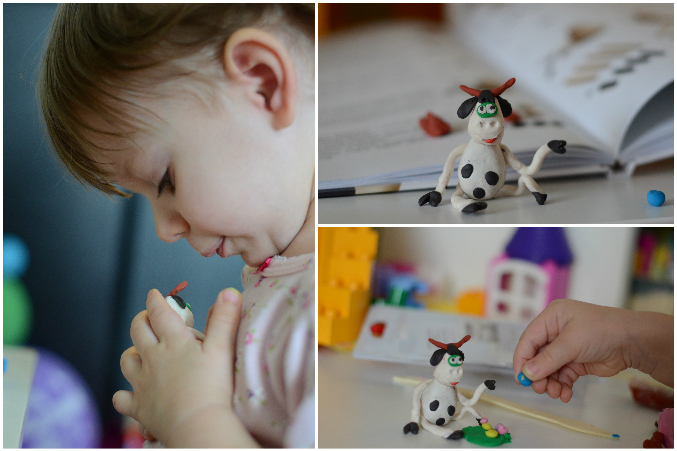 Корову лепила я, Ми сделала ей пятнышки на теле и потом кормили корову конфетками на полянке.