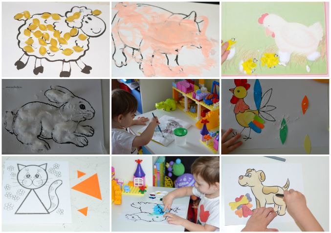 Аппликации: очень нравится Ми клеем мазать, стала очень аккуратно и к месте намазывать, меня к процессу не допускает, сама мажет, потом ставит на стол тюбик, закрывает крышкой, приклеивает детальку и снова мажет.
