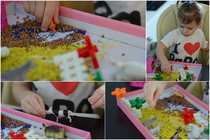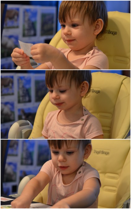 Играли в лото. Хорошо играть с одной карточкой на человека и отобрав предварительно к ним плошки. Но Ми рвалась в бой и просила бооольше карточек, потом терялась и не могла в таком большом количестве найти нужное животное.