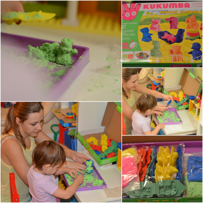 Лунный песок. Милана возилась руками и насыпала в формочку, училась зажимать 3д формы.