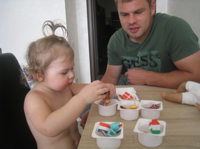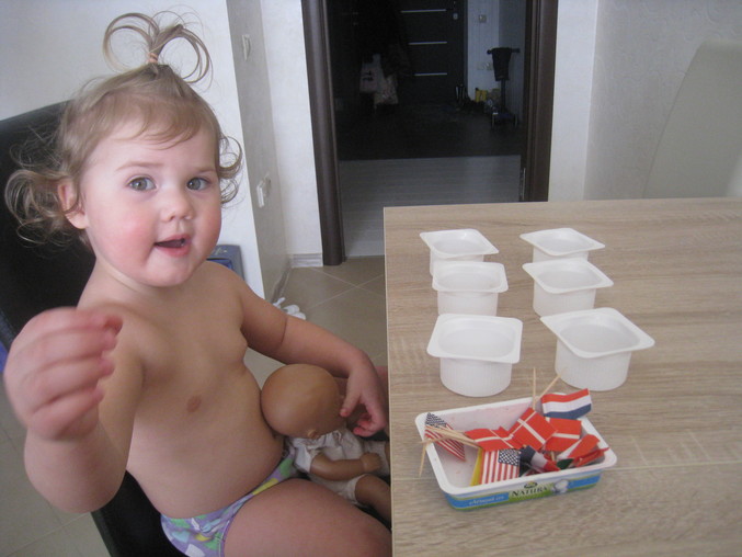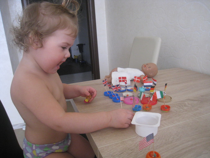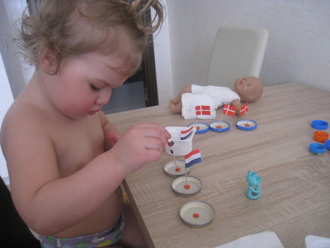 А потом мы делали кораблики из крышек, на которые устанавливали наши флаги. Поскольку флаги разных стран, то и корабли тоже были разные для каждой страны. Сонечка все подобрала верно. искала одинаковые три крышки и прикрепляла на них флажки.