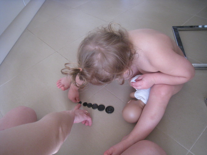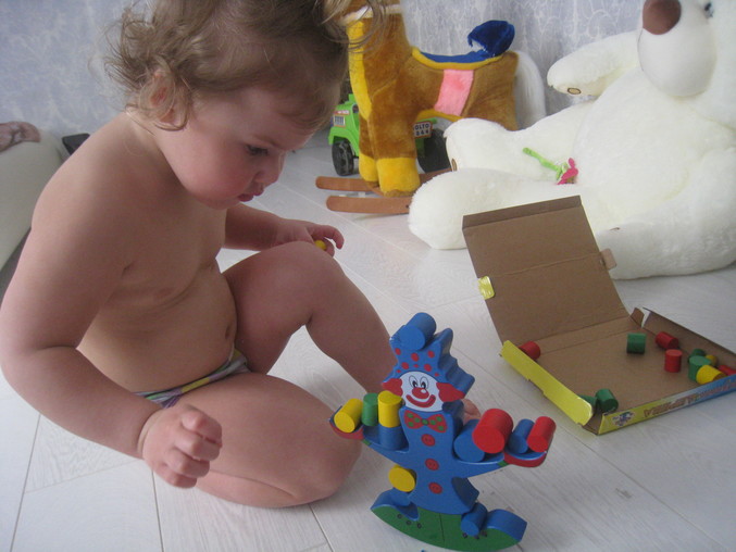 Дальше решили поиграть с клоуном-балансиром. Теперь говорит, что вот этот цилиндрик тяжелее, а этот легче. Нравится просто нагружать и ставить цилиндры по разному, то горизонтально, то вертикально. А еще башни строим из них. Ставим по очереди и смотрим у кого упадет, то и проиграл.