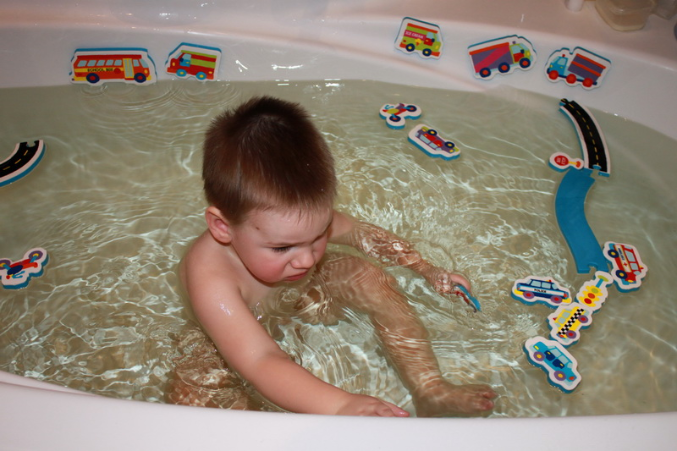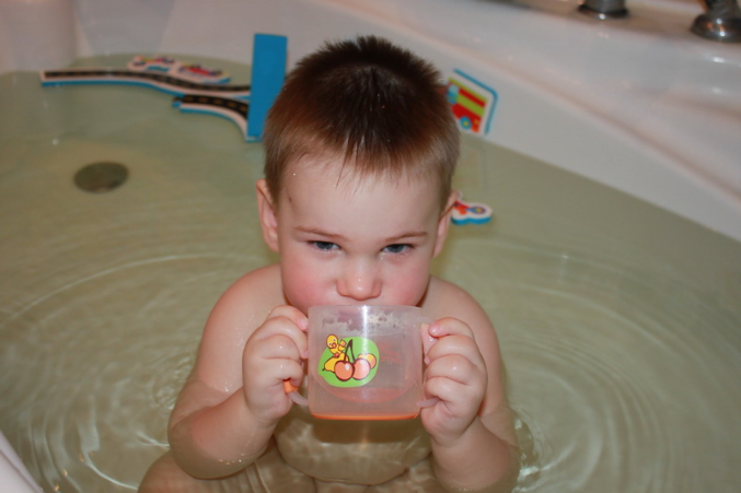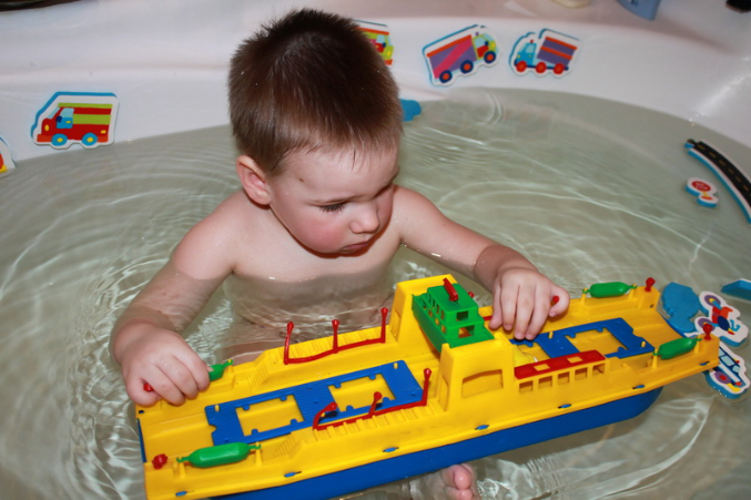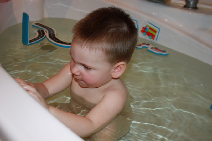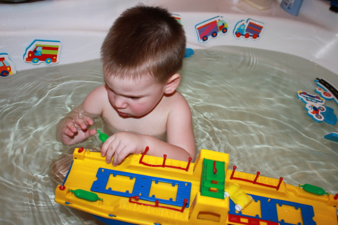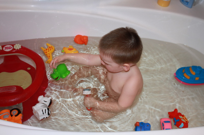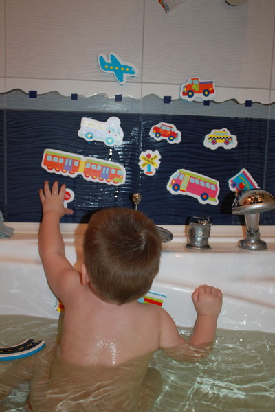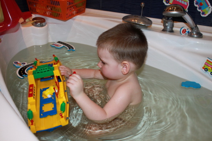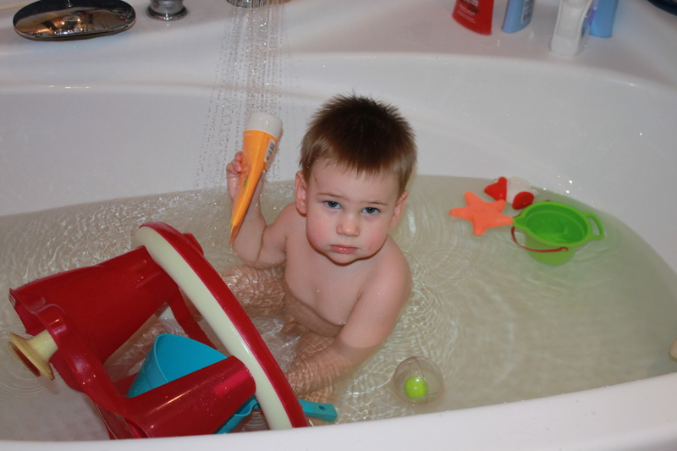 Иногда самые лучше лучшие игрушки - это различные флаконы и тюбики из-под шампуней и гелей )) Пришлось пару штук освободить от содержимого, дабы не съел и не выпил. Ну и на худой конец сойдут ведерки, лопатки, формочки - т.е. то, что для песочницы (на фото только ведерко попало). И вообще все то, что можно мочить.